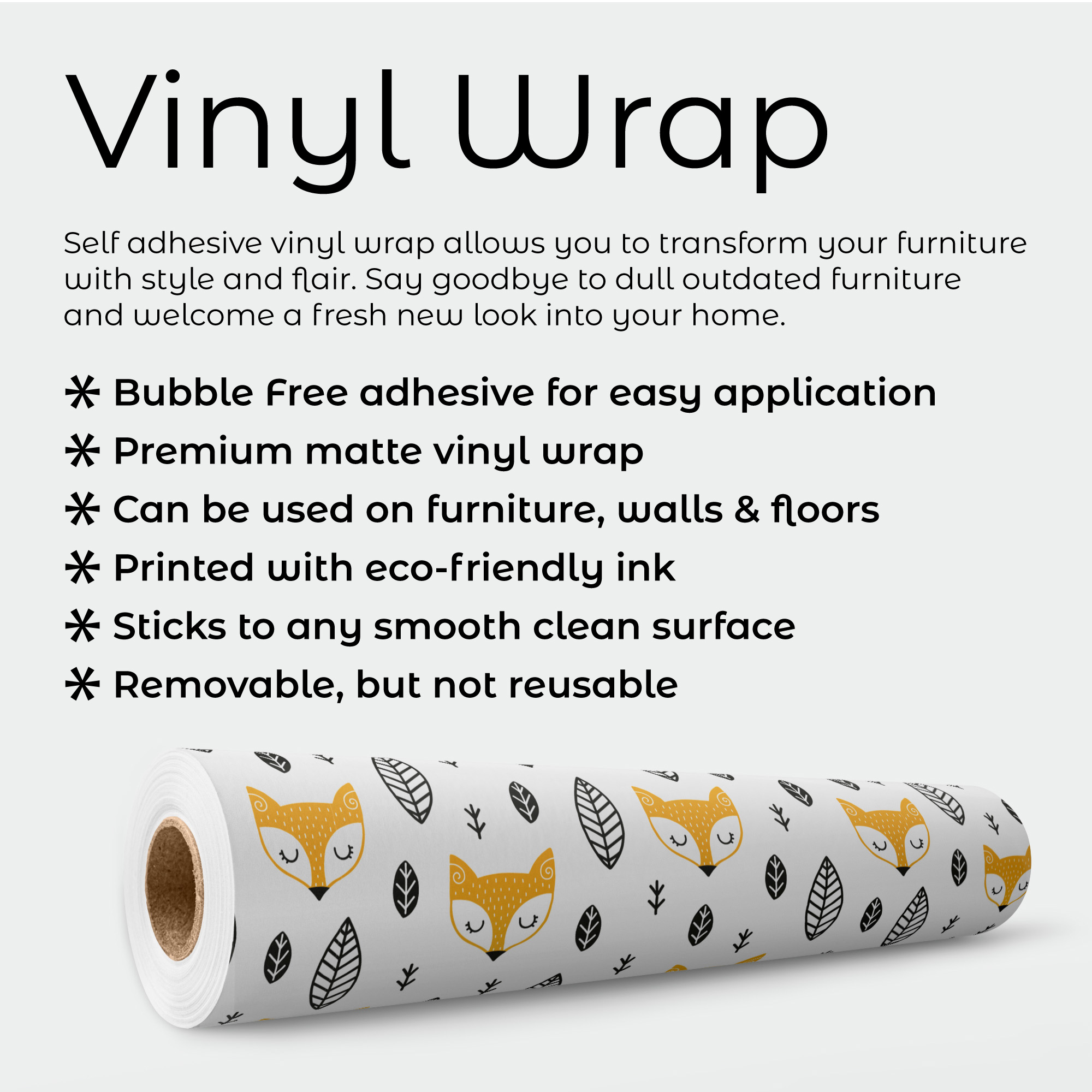 Scandi Fox Vinyl Wrap Sticker. Our standard vinyl range is a bubble free, easy application matt film suitable for flat and slightly curved surfaces. Perfect for standard furniture wraps, like tables, cupboards, splash backs etc.
